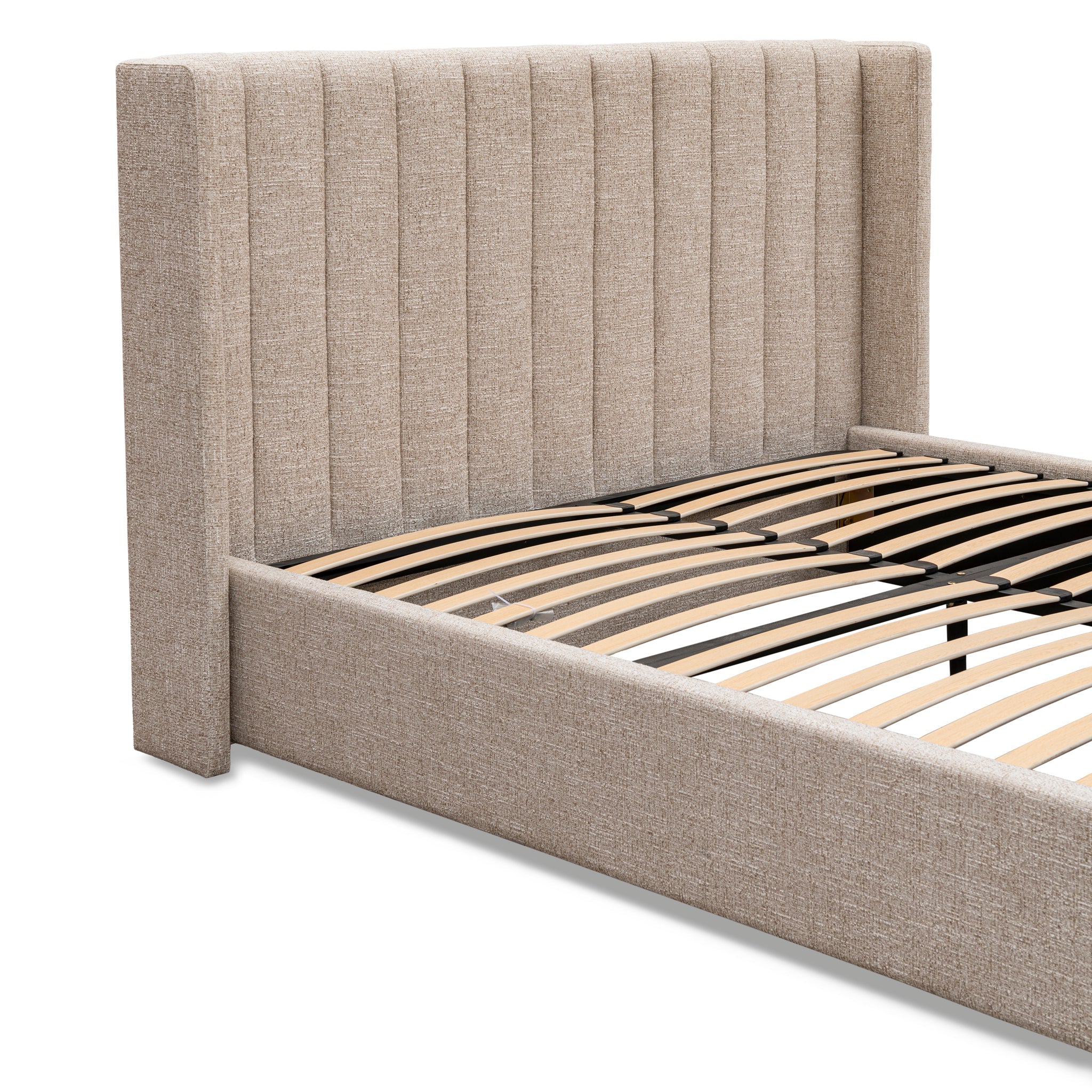 Discover the perfect blend of elegance and everyday comfort with the King Wide Base Bed Frame - Pale Beige.Pale beige polyester upholstery Timber, solid wood, and P4 plywood frame Wide vertical panel tufting on the headboard Medium frame firmness Rubber legs Foam filling Gas lift mechanism supporting up to 50 kg Sized to fit a standard king mattress Weight Capacity: 380 kg This product is supplied flat-packed and requires assembly by two people Note: Bed mattress not included Please ensure your mattress is compatible with the provided slat construction of this bed frame.213cm (W) x 220cm (D) x 112cm (H) Height: floor-bed base: 46cm Headboard: 213cm (W) x 25cm (D) x 112cm (H) Bedside Frame: 168cm (W) x 210cm (D) x 40cm (H) Leg Height: 5cmBox 1/4: 202cmx18cmx134cm, 37kg, 0.4872cbm Box 2/4: 208.5cmx42.5cmx28cm, 38.6kg, 0.2481cbm Box 3/4: 58.5cmx19cmx15cm, 2.6kg, 0.0167cbm Box 4/4: 186cmx13cmx106cm, 26.5kg, 0.2563cbm