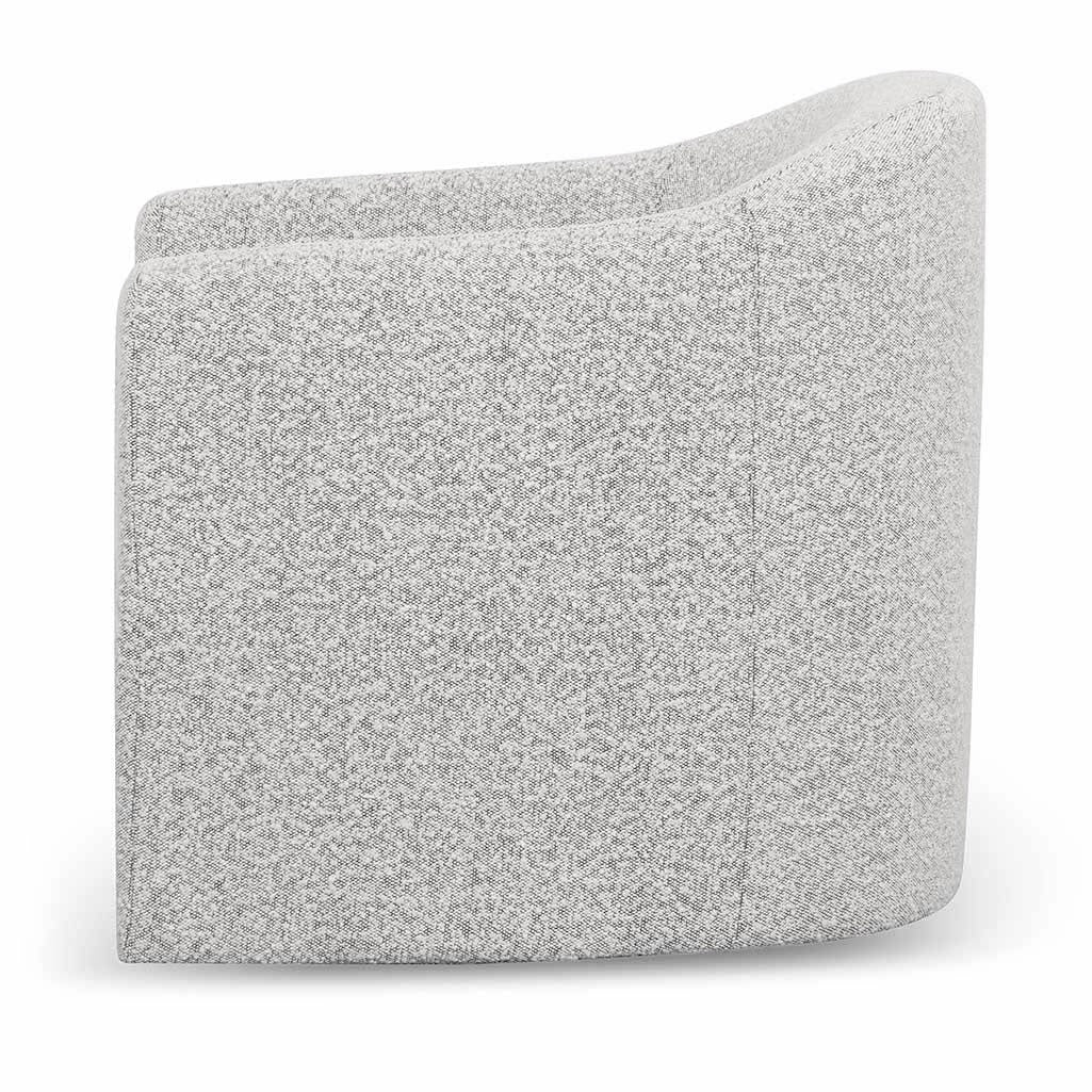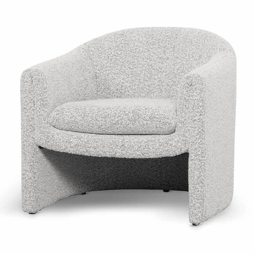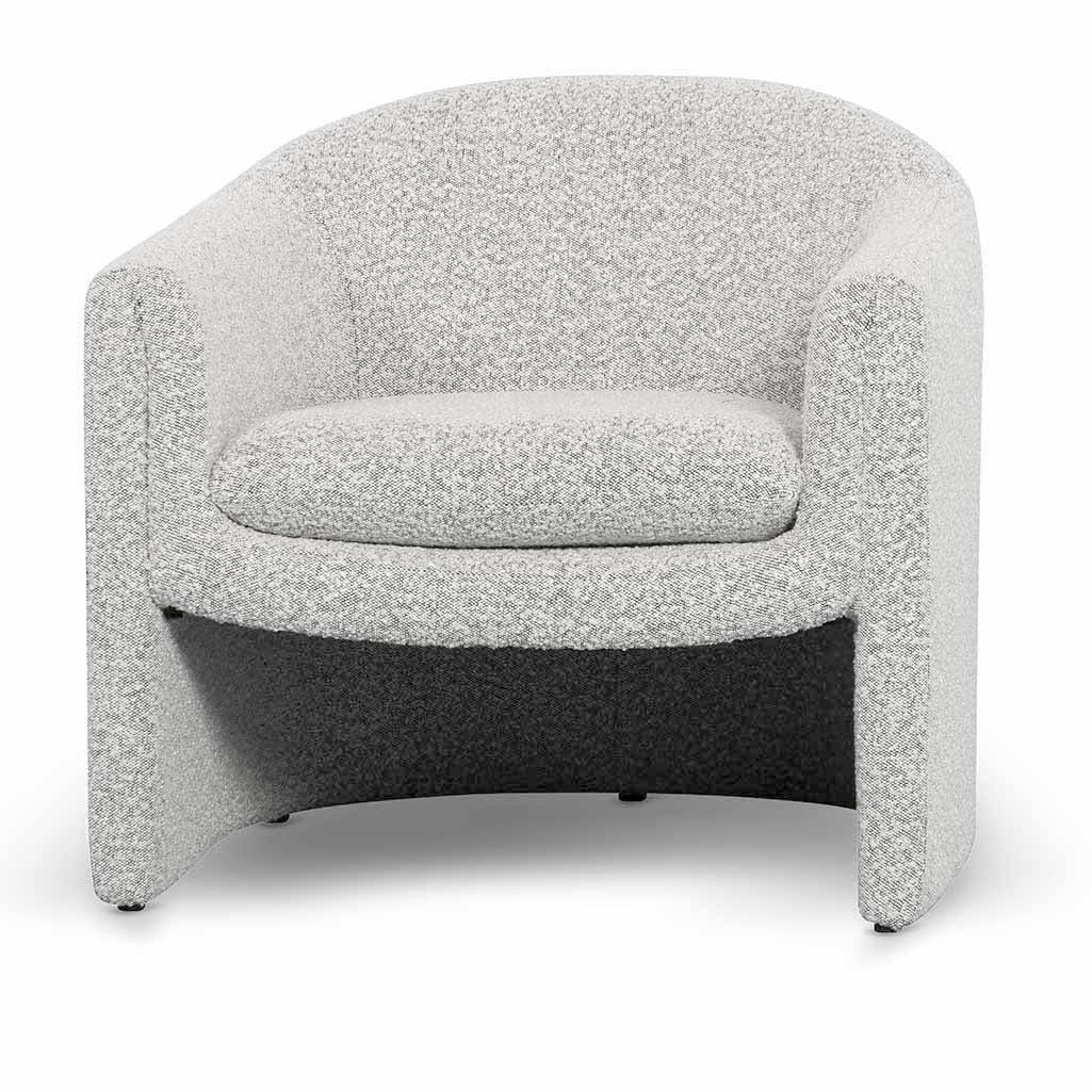 Complement your modernist space the the monochrome charm of Armchair - Charcoal White Boucle.Upholstered in a Charcoal white boucle fabric Fabric consists of a 54% polyester and 46% acrylic blend Frame in a pine wood construction Legs in a polypropylene build with a cut-out design Seat and backrest with a foam insert Web suspension with medium seating firmness Tub chair silhouette and curved backrest Product comes fully assembled Melbourne pick-up and delivery only82cm (W) x 78cm (D) x 76cm (H) Seat Dimensions: 54cm (W) x 58cm (D) x 47cm (H) Leg Height: 2cmBox 1/1: 84cmx80cmx78cm, 32kg, 0.5242cbm