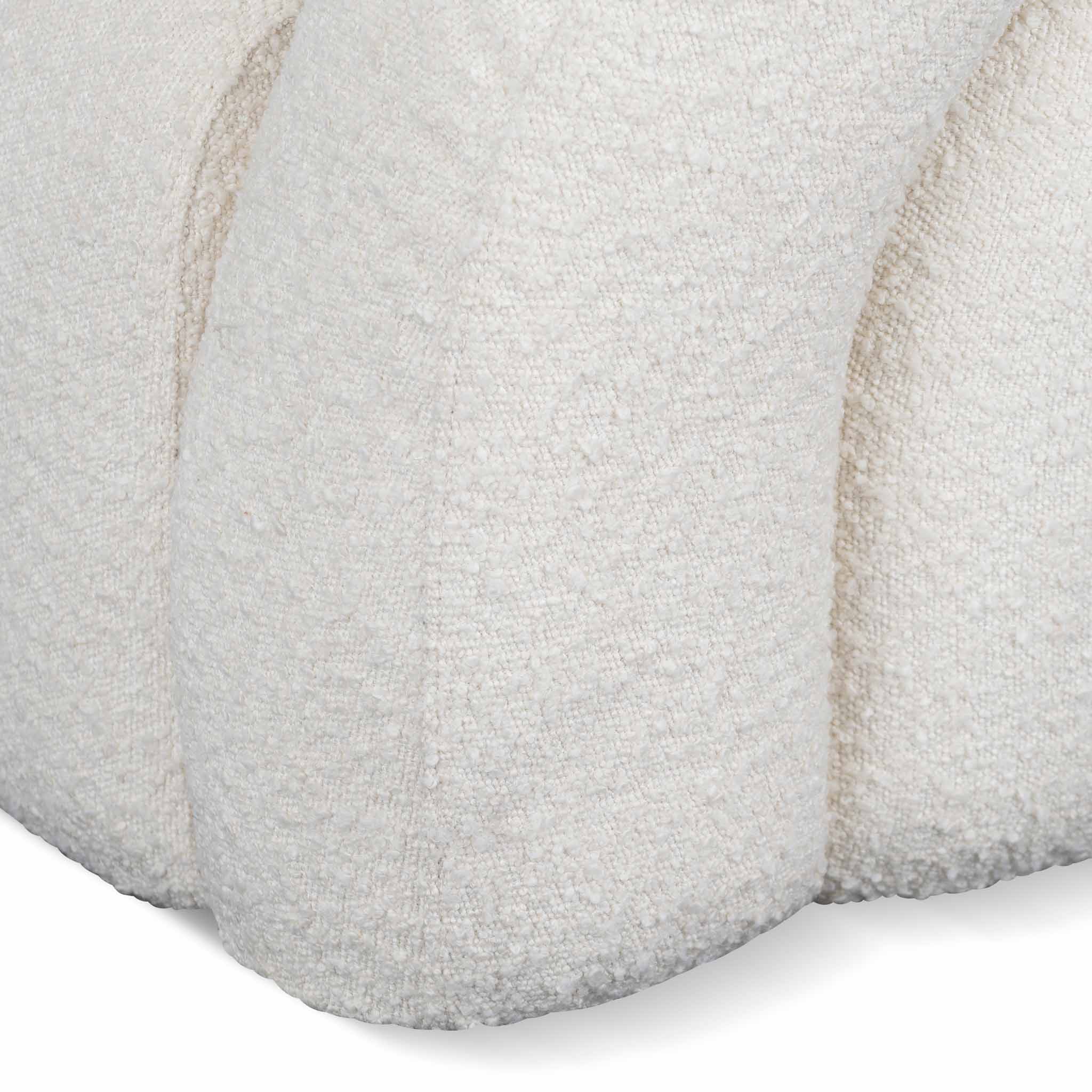 Swivel Armchair - Ivory White Boucle revives the post-modern Italian artistry.54% Polyester and 46% Acrylic upholstery Ivory White Boucle Fabric Pine wood frame with iron base Spring suspension with Foam filling Soft-medium seat firmness Smooth swivel mechanism 120kg weight limit Minor Assembly Required90cm (W) x 88cm (D) x 72cm (H) Seat: 54cm (W) x 58cm (D) x 43cm (H) Arm Height: 38cm Leg Height: 4cmBox 1/1: 94cmx90cmx75cm, 45kg, 0.6345cbm