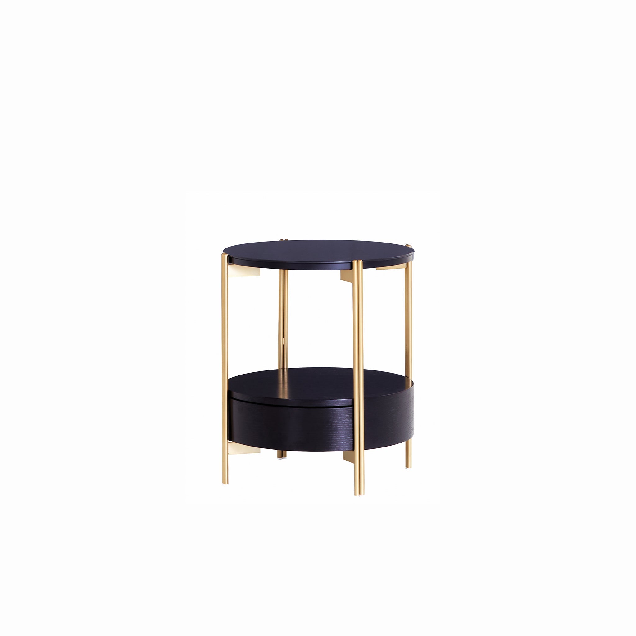 Introducing the Side Table in Black, a sleek and sophisticated addition to redefine your space.Black glass tabletop Engineered wood with oak veneer rounded shelf Metal legs in gold powder coating Two-tiered frame design Weight capacity: 25 kg Product requires two-person assembly45cm (D) x 54cm (H) Box: 45cm (D) x 11.7cm (H) Leg: 10.5cm (H) Distance between legs: 31.2cmBox 1/1: 56cmx52cmx31cm, 14.6kg, 0.0903cbm