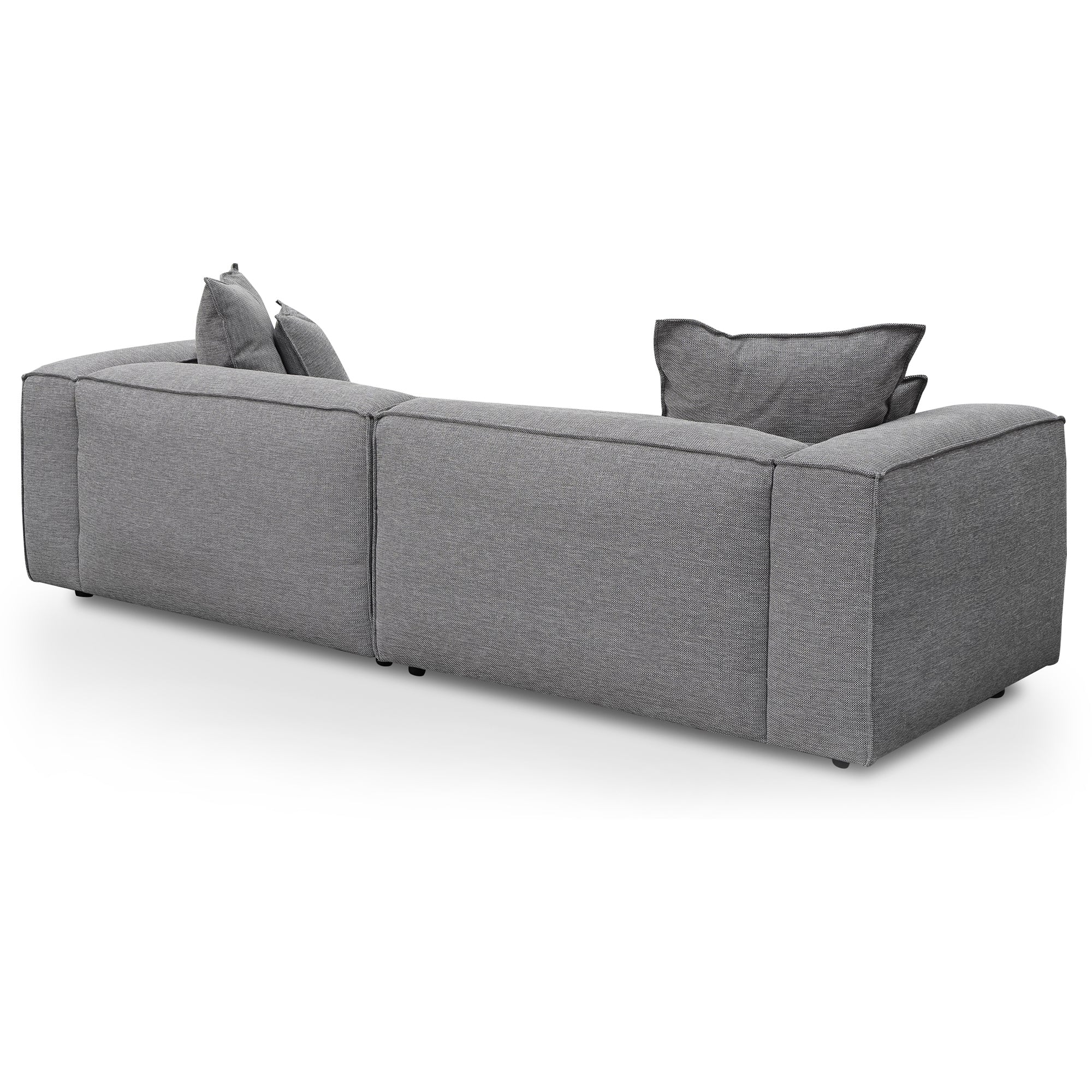 Transform your living space with the contemporary urban 4 Seater Sofa with Cushion and Pillow – Graphite Grey.Upholstered in durable Graphite grey fabricFabric consists of a 90% polyester and 10% acrylic blendHigh-grade webbing and spring insertPlush padding with foam density greater than 35Includes premium duck feather fillingCompact wood feet in powder black finishDeep seat with low-rise connected backrest and armrestsInverted seaming along edges2x separable sections for added versatility2x small and 2x medium matching scatter cushionsExtra soft seat cushions that are filled with feathers and foam. Natural sagging will gradually occur over timeProduct requires two-person handling265cm (W) x 110cm (D) x 67cm (H) Seat Height: 42cm Seat Depth: 76cmBox 1/2: 67cmx139cmx115cm, 47kg, 1.071cbm Box 2/2: 67cmx139cmx115cm, 47kg, 1.071cbm